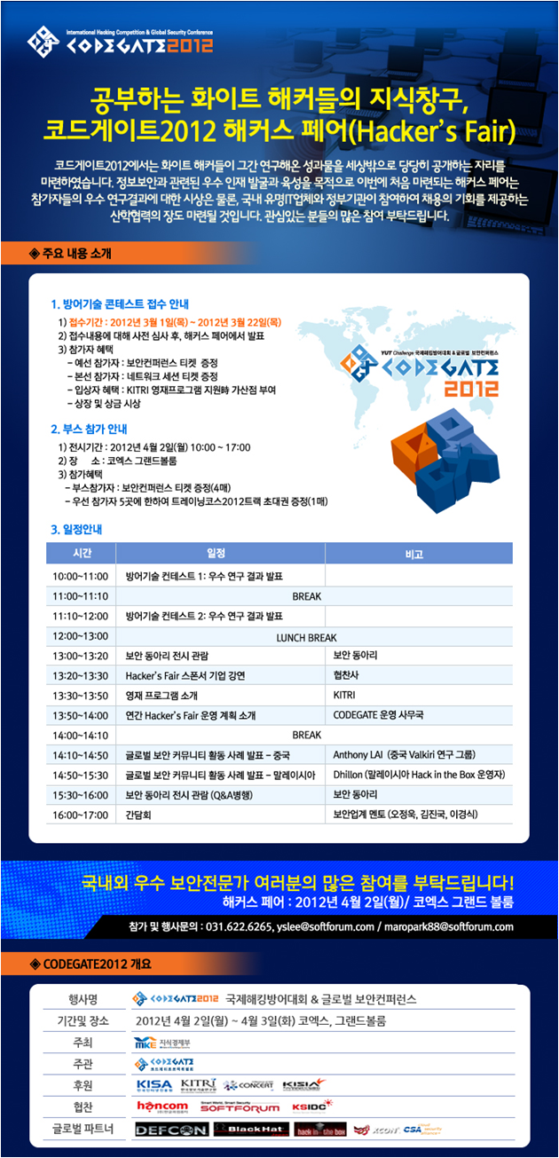 - Àü½Ã ±â°£ ¹× Àå¼Ò: Hacker¡¯s Fair Çà»ç ±â°£(2012³â 4¿ù 2ÀÏ ¿ù¿äÀÏ 10:00~17:00)