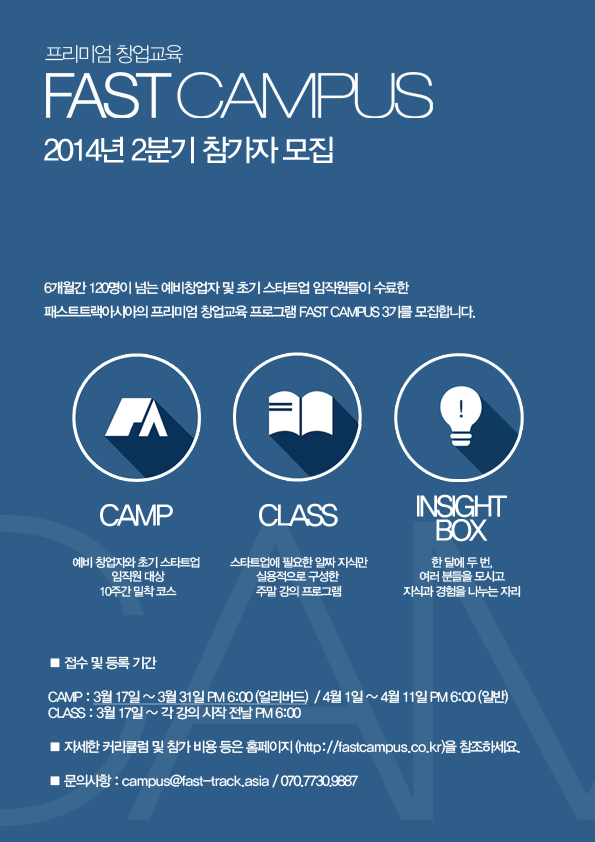 ÆÐ½ºÆ®Ä·ÆÛ½º(FAST CAMPUS)´Â 10ÁÖ°£ °ÀÇ¿Í 1:1¸®ºä, ³×Æ®¿öÅ· ÆÄƼ µîÀÇ ¼ºñ½ºµéÀÌ ¹ÐÂø Á¦°øµÇ´Â CAMP, ÁÖ¸» ¿ÀÀü°ú ¿ÀÈĸ¦ ÀÌ¿ëÇØ °ü½É ÀÖ´Â Á÷¹« °úÁ¤ÀÇ °ÀǸ¸ °ñ¶ó µè´Â CLASS, ÀλçÀÌÆ® °¡µæÇÑ ¿©·¯ ºÐ¾ßÀÇ ¿¬»çµéÀ» ÃÊÃ»ÇØ ÇÑ ´Þ¿¡ µÎ ¹ø ´Ù¾çÇÑ À̾߱⸦ µè´Â INSIGHT BOX·Î ÀÌ·ç¾îÁ® ÀÖ½À´Ï´Ù.
