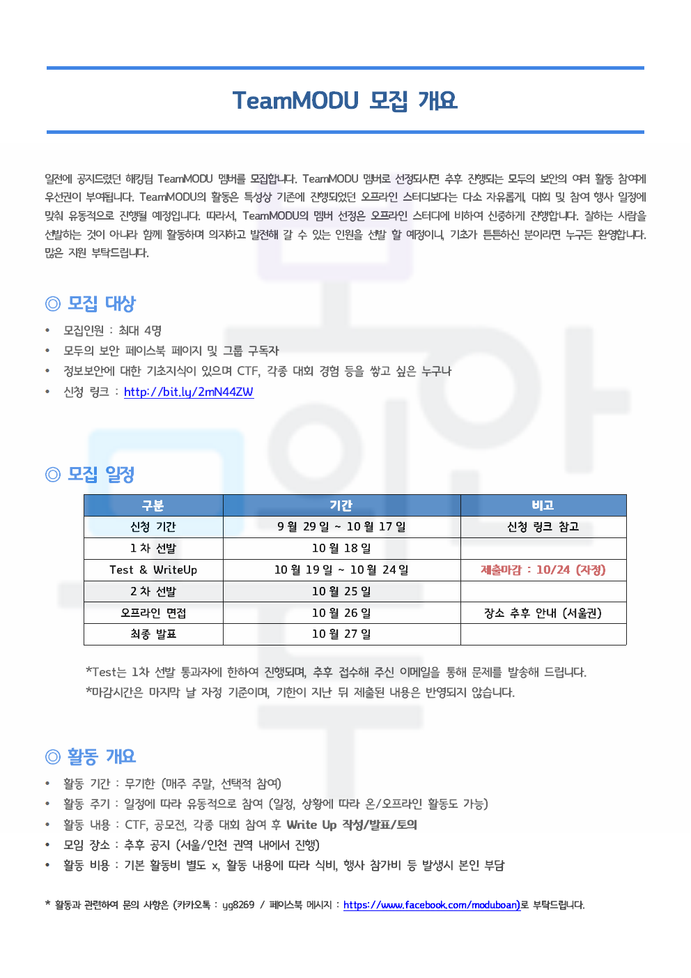 - ¸ðÁý ±â°£ : 9/30 ~ 10/26 (½Åû ¸¶°¨ 10/18 »ó¼¼ÀÏÁ¤ È®ÀÎ)